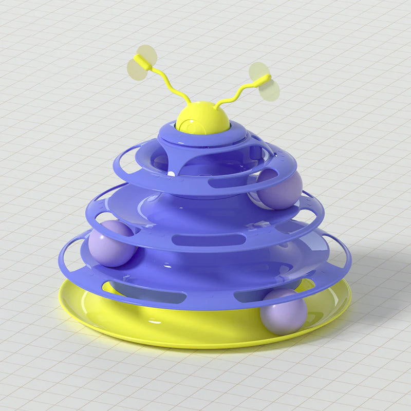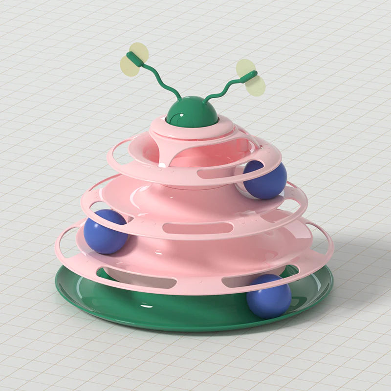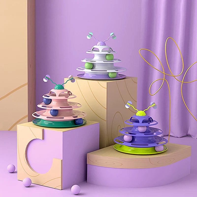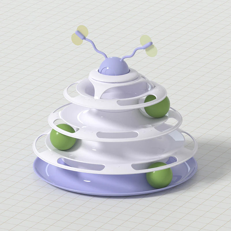 - Whether you have one cat or more, the Tower of Tracks will keep your furry friends enticed with bright colors and spinning balls.