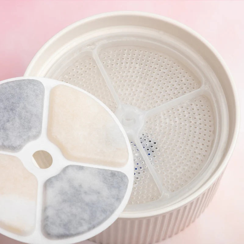 Enhanced Filtering System: Introducing our Cloud Cat Water Fountain, boasting an upgraded filtering system that incorporates cross PP cotton, KDF water gold, and natural coconut shell activated carbon. This advanced system ensures your cat's water remains pure and free from impurities, while the added filter tray effectively blocks hair and debris, preventing them from re-circulating into the drinking water below.