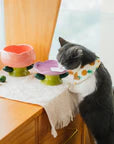 - Raised Baes: The ceramics base raises the cat food and water bowl set to a more convenient height, your cat could comfortably eat and drink without having to strain his neck down, it also helps to protect the cat's spine. Perfect for aging cats.
