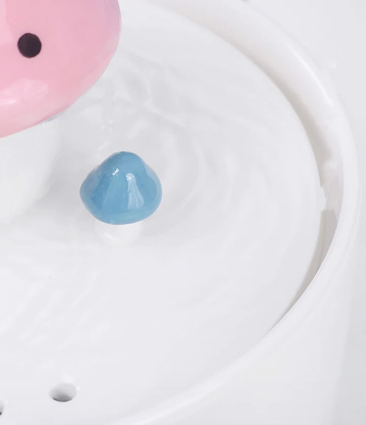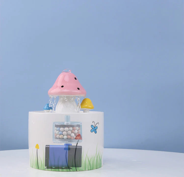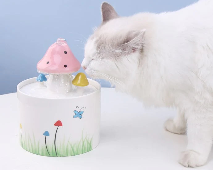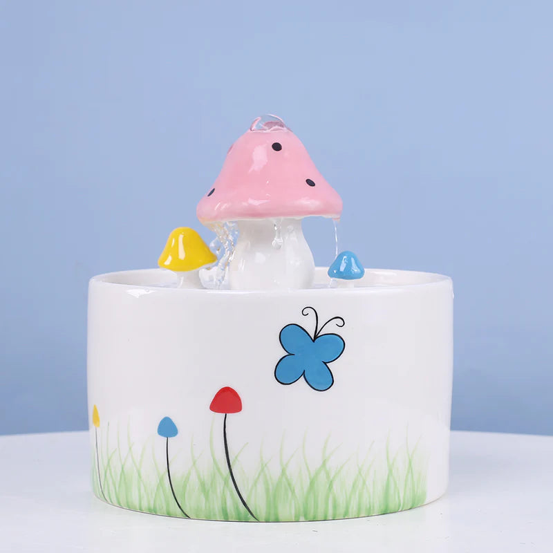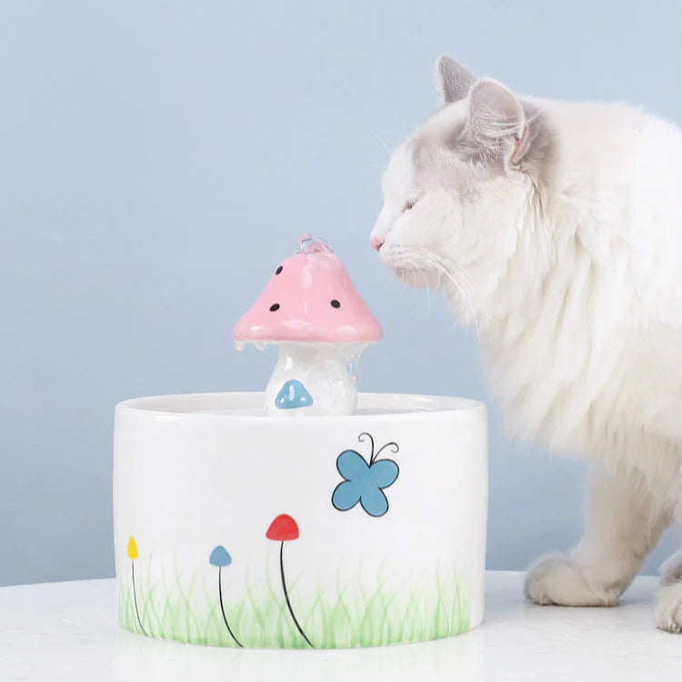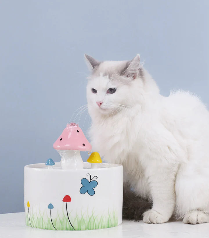 Mushroom Shaped USB Pet Ceramic Automatic Drinking Fountain is a cat water fountain with steady clean filtered water.