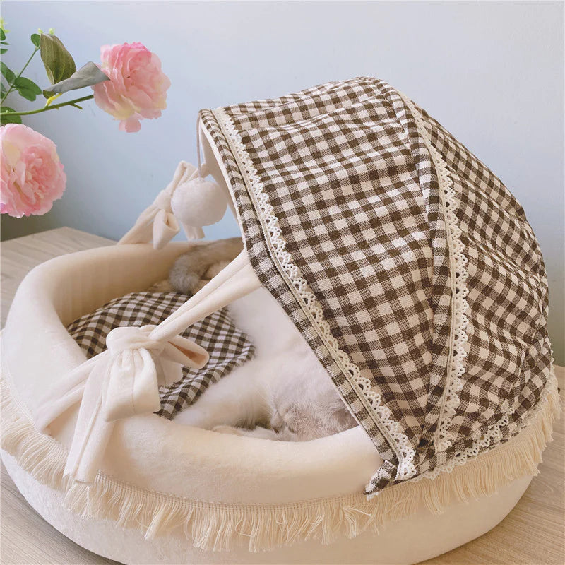- A semi-closed plaid bed offers your pets good sleeping time.